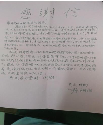 第二天,黎先生来到车队取回手提包,当面感谢两位驾驶员和队长,并写下一篇感谢信送到车队,赞赏这种助人为乐,拾金不昧的精神。