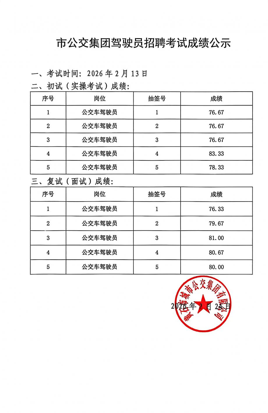 市公交集团驾驶员招聘考试成绩公示